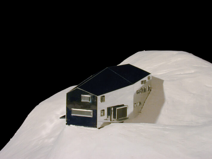 Die hoch reflektierende Fassade aus Titanblech vermag in der hochalpinen Umgebung Berggängerinnen und Berggänger aus der Ferne- ähnlich einem überdimensionierten funkelnden Kristall- Leit- und Orientierungspunkt sein, zugleich spiegelt sich die fulminante Bergwelt beim Näherkommen.
