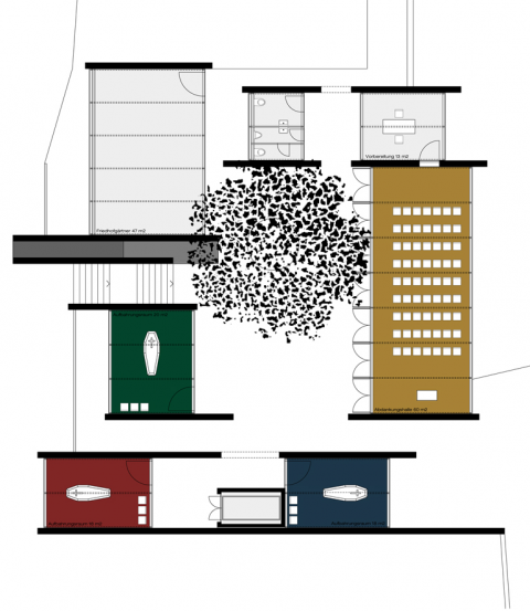 Der Weg als Lebensweg, wo Lebensabschnitte als Räume wahrgenommen und unterschiedlich farbig empfunden werden können: Jeder Raum ist mit den anderen Räumen durch Erinnerung verbunden, der Tod als gesellschaftliches Tabu, dies sind die wichtigen Themen des Entwurfs. Transluzide farbige Gläser referieren auf die Tradition der Kirchenfenster, strukturieren den Aussenraum und verweisen auf die Sinnlichkeit des Lebens. Sie filtern die Wahrnehmung und führen durch den stillen Raum des Ortes, wo das Leben ein Ende gefunden hat.