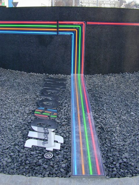 Um die Leuchtkraft der Schrift und der Leuchtstreifen durch einen deutlichen Kontrast zu verstärken, wurde der Kern als Betonzylinder schwarz eingefärbt und mit Basaltkies versetzt.