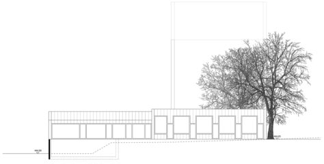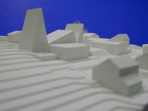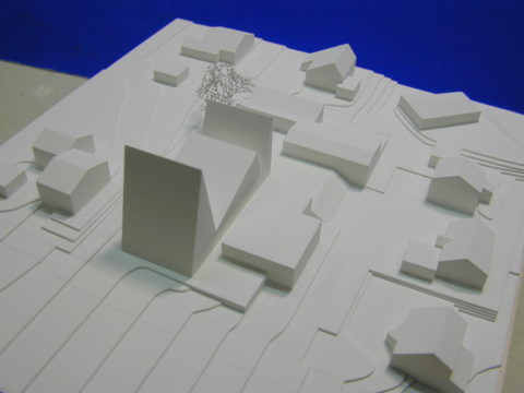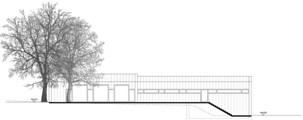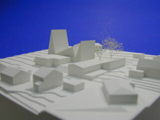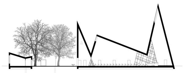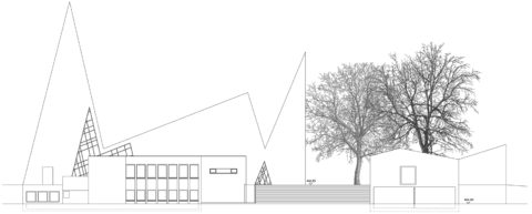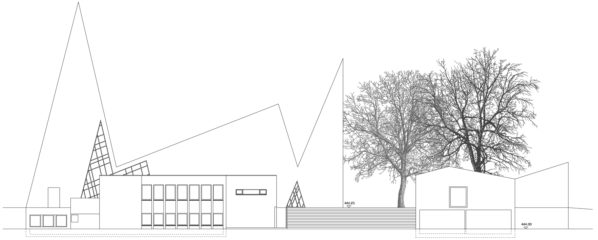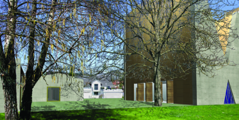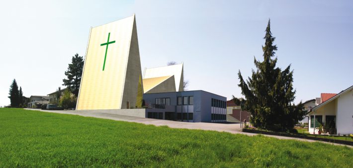Angebunden an das bestehende Kirchgemeindehaus wird mitten in eine Einfamilienhauszone die neue Kirche gesetzt. Ihre expressive Form referiert auf die Dreifaltigkeit und setzt im Quartier durch ihre deutliche Überhöhung ein markantes Zeichen. Die Dachhaut des Sichtbetonbaus wird mit einem goldenen Messingblech verkleidet und setzt durch seine Reflexionen des Sonnenlichts zusätzliche Akzente.
