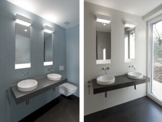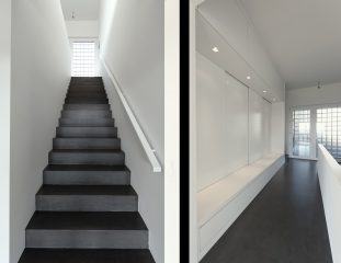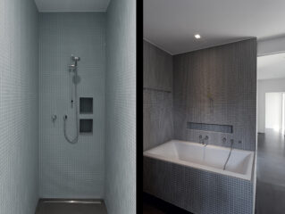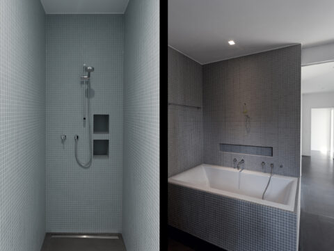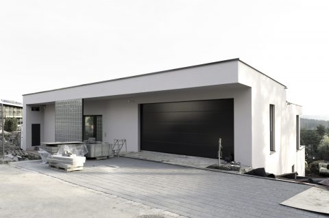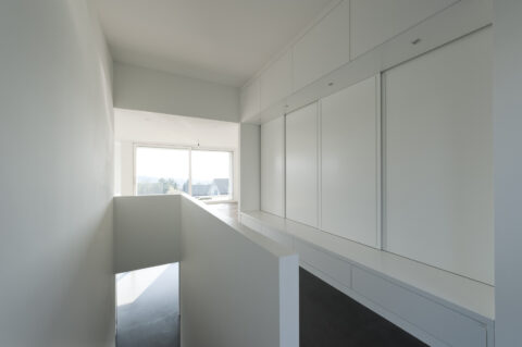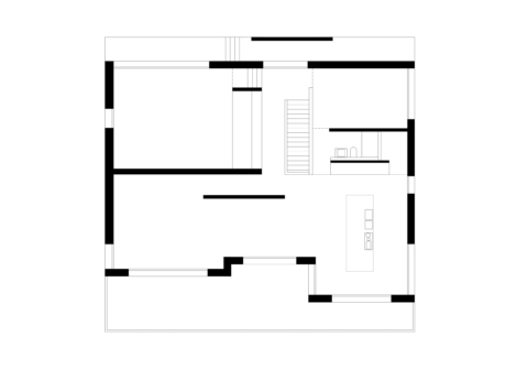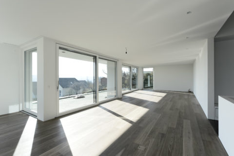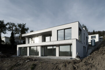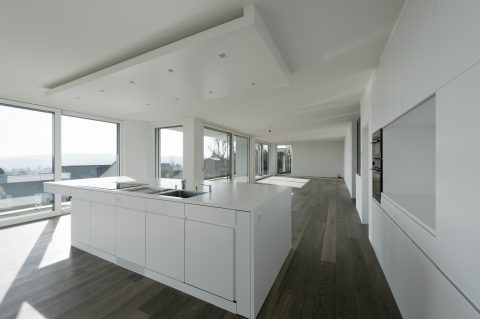 Der Neubau liegt in einer Einfamilienhauszone mit leichter Hanglage, wodurch talseitig ein grossartiger Weitblick entsteht. Hangseitig eröffnet das erste Obergeschoss die Erschliessungszone, Wohnraum, Terrasse und Küche sind daran angegliedert. Die privateren Räume befinden sich im Untergeschoss, wo die Schlafzimmer direkten Zugang zum Garten haben.