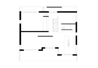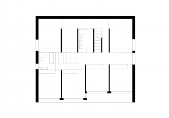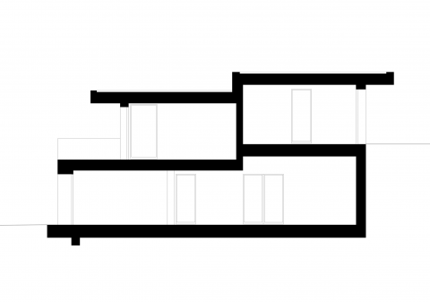Die Gebäudestruktur ist auf den zwei Geschossen unterschiedlich ausgerichtet: Im Erdgeschoss bilden die zur Strasse hin parallelen Scheiben einen gestaffelten Sichtschutz und Filter gegen den Hang mit grösserer Öffentlichkeit, im Untergeschoss stehen die Scheiben um 90 Grad gedreht und orientieren sich zum Tal und zum Garten hin.