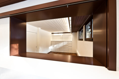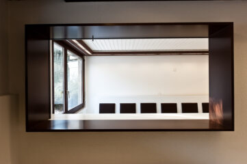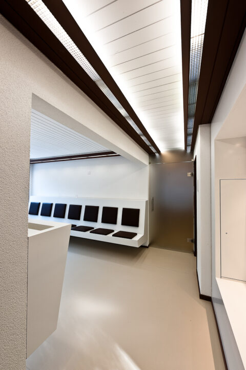 Empfang, Garderobe und Wartezone sind das Herzstück dieser Gemeinschaftspraxis mit Behandlungs- und Besprechungzimmern, Archiv, Büro, Labor und Bibliothek.