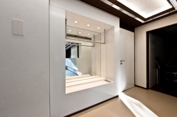 Die Empfangszone wird als Einheit gestaltet, Garderobe, Wartebank und Empfangstheke sind als integrierte Bausteine eines Ganzen inszeniert, die Atmosphäre ist leicht schwebend und neutral gehalten. Die lange Wartebank verbindet Patientinnen und Patienten im Moment der Ungewissheit, der Aufregung, in der vermeintlich langen Wartezeit bis zum Aufruf des Arztes.