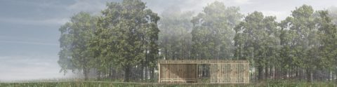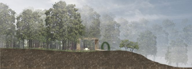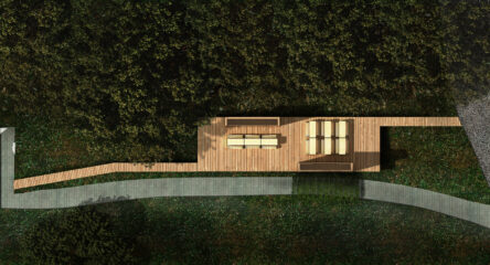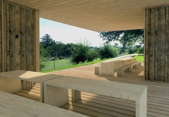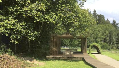 Der offene Pavillon am Waldrand, weg von Verkehr und Alltagshektik, soll Unterrichtsformen ermöglichen, die den Schulalltag ergänzen. Über einen Steg werden Schülerinnen und Schüler dem Waldrand entlang geführt hin zum Podest, wo zwei Scheiben das weit auskragende Dach tragen.