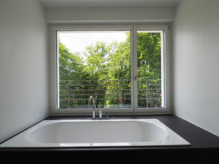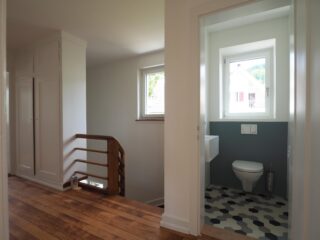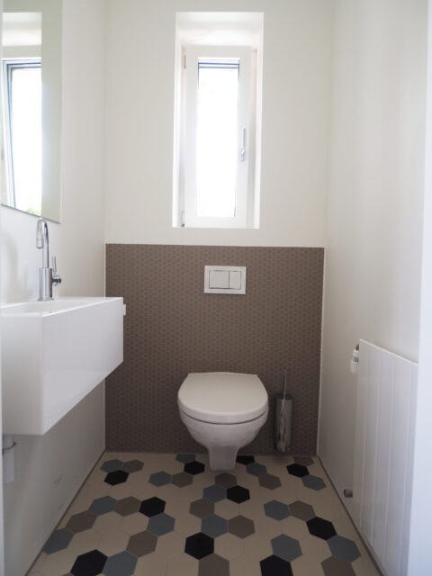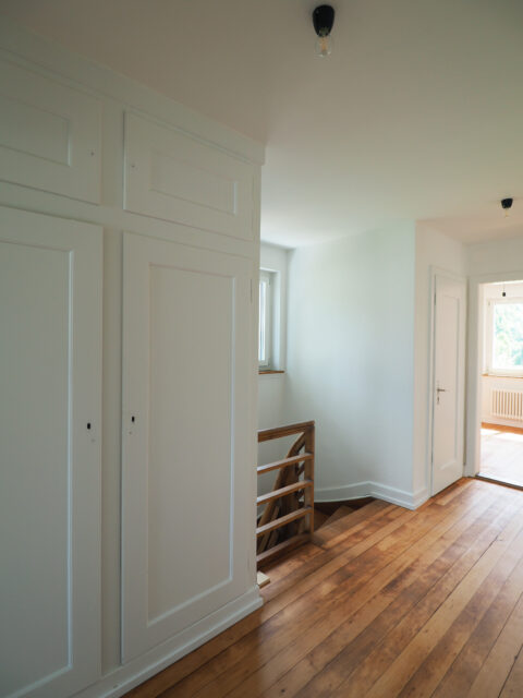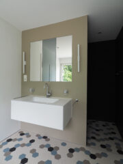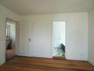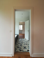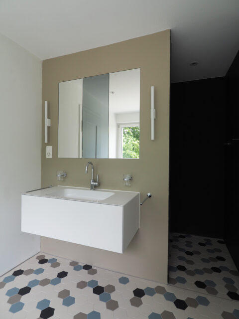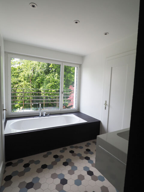Das Spiel umfasst verschiedene Ebenen: Der neu verlegte Holzparkett im Wohnzimmer wechselt von streng orthogonal zu diagonal, die sechseckigen Bodenplättchen der Badezimmer verlassen in Farbe und Anordnung das strenge Muster, die Badewanne rückt an das Fenster mit Aussicht, die Spiegel sind einerseits durchlässig und andererseits reflektierend. All diese kleinen Eingriffe verändern die gewohnte Wahrnehmung und schliessen an das wertige und sensible Bauen der Gründerzeit an.