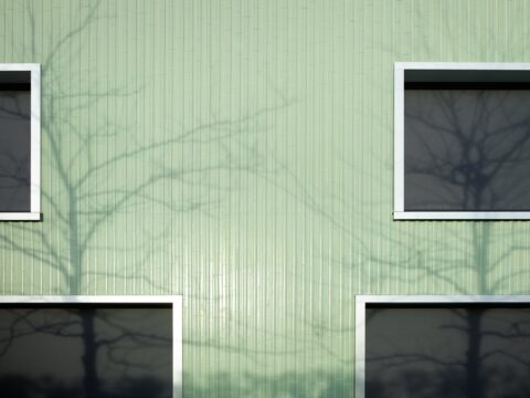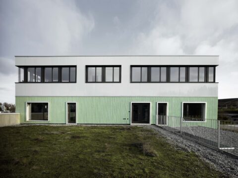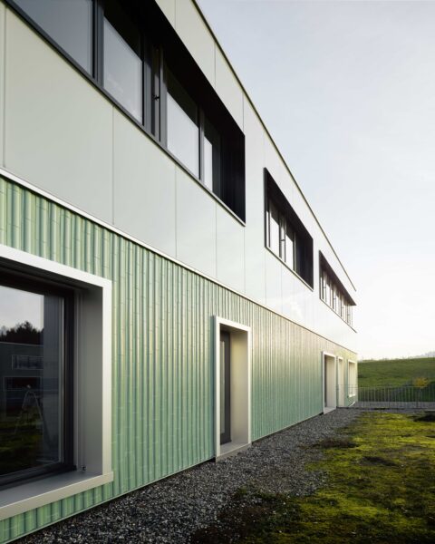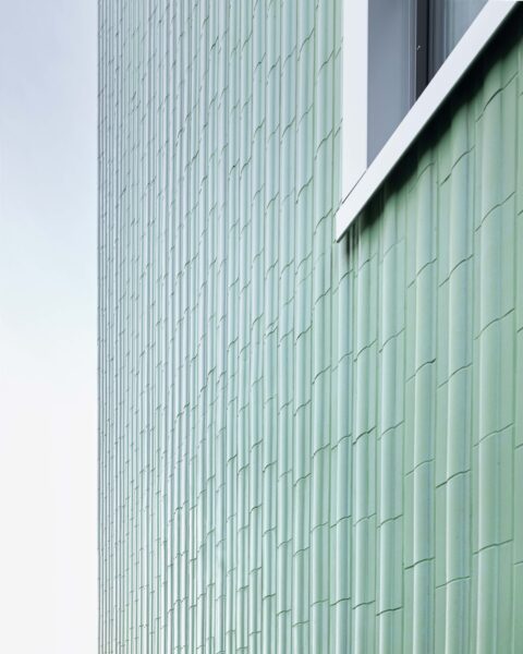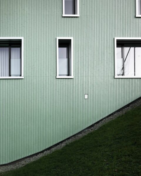 Speziell entwickelte wellenförmige Keramikplatten umfassen den Baukörper und geben ihm eine bewegt geschuppte Struktur, die sich sowohl vom nahen Waldrand wie auch vom Reflex der sichtbaren Seeoberfläche inspirieren liess. Die zweifarbige Lasur in grün und blau oszilliert je nach Tageslicht in verschiedener Farbigkeit und spinnt die asymmetrische Bewegung der einzelnen Platten weiter zu einem schillernden Lichtspiel.
