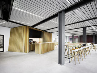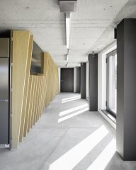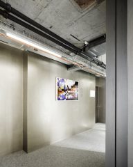 Die Gebäudestruktur wurde bewusst im Rohbaustatus belassen und um die architektonischen Eingriffe signifikant erweitert. Dabei wurden jene Materialien ausgewählt, die zwar kontrastreich zur industriellen Erscheinung des Rohbaus stehen, diesen aber in eine warme Stimmung überführen.