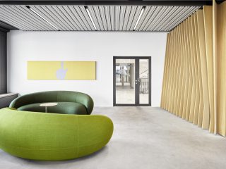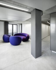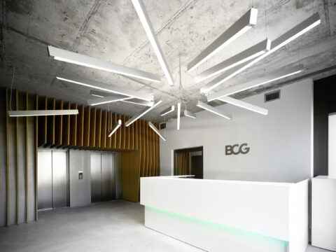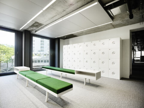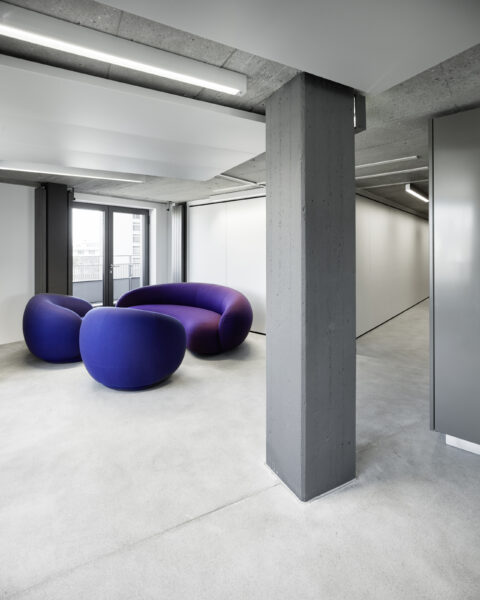 Der vertikale Treppenkern wird auf jedem Geschoss markant ausgezeichnet und trägt dazu bei, dass im Innern die Zugehörigkeit zu BCG überall spürbar wird.