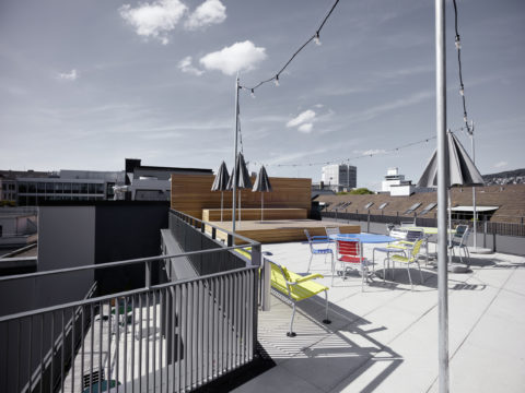 Im Erdgeschoss bildet der Connector das kommunikative Zentrum, im obersten Geschoss ergänzt die gestaltete Terrasse die Erholungszone.