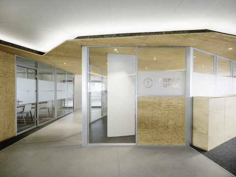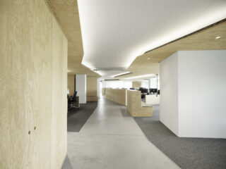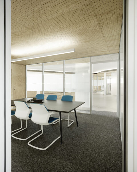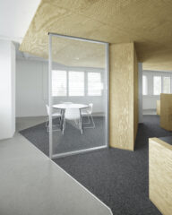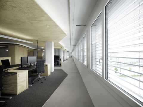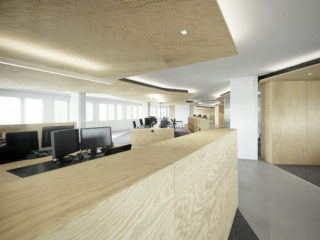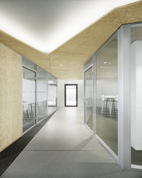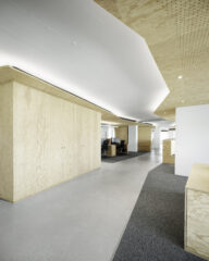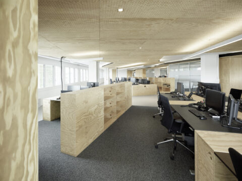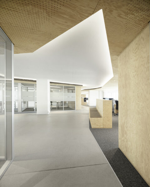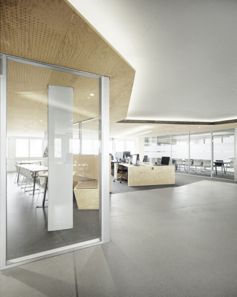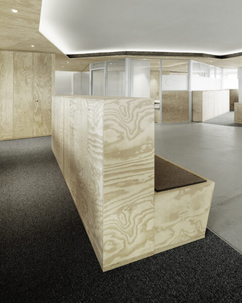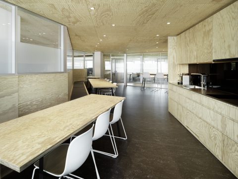 Als gesamte Arbeitslandschaft konzipiert und sich an der Decke spiegelnd, sind die gesamten Einbauten als ein einziges grosses Möbel gedacht, das unterschiedlichste Tätigkeiten ermöglicht: Arbeiten am höhenverstellbaren Pult, Meetings, Erholungs- und Verpflegungszonen wechseln sich ab und schaffen ein visuell abwechslungsreiches Raumkontinuum. Die Seekiefer als dominantes Baumaterial schafft in der rohen Industriehalle einen Kontrapunkt und generiert eine warme Arbeitsatmosphäre.